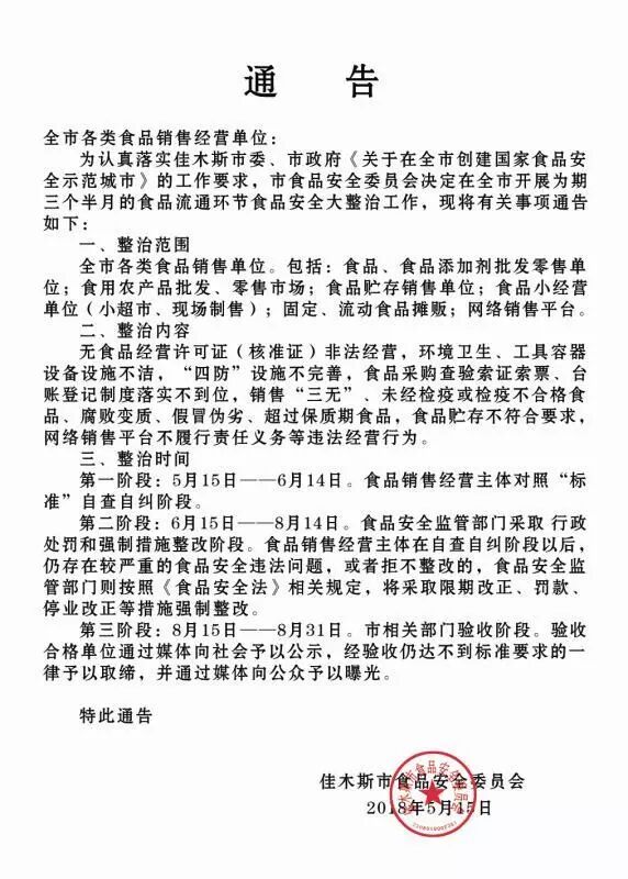 为认真落实佳木斯市委、市政府《关于在全市创建国家食品安全示范城市》的工作要求,市食品安全委员会决定在全市开展为期三个半月的“食品销售领域安全大整治”行动,现将有关事项通告如下: